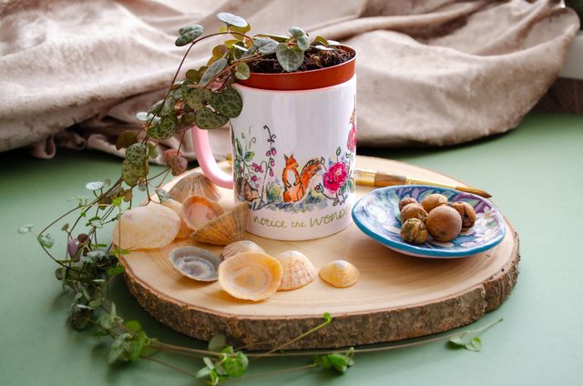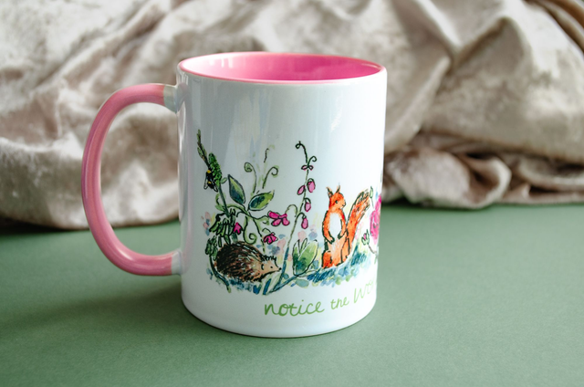 Dishwasher & Microwave safe 11oz ceramic mug. Designed by hand with ink & watercolour, the mug showcases much loved flora & fauna including an Irish hare, red squirrel, hedgehog, robin, blue tit, bumble bee, common blue butterfly, roses & sweet peas.